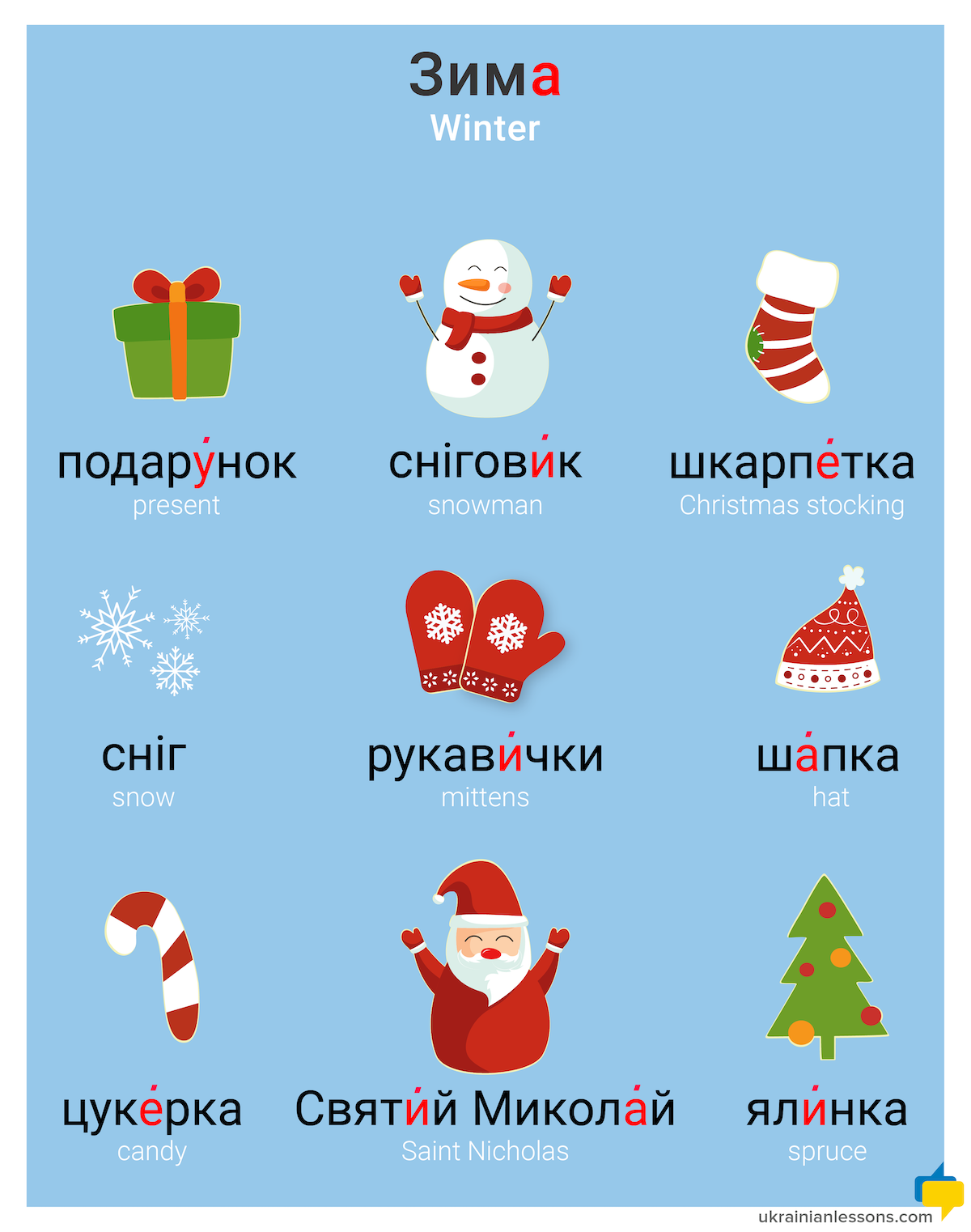 Let’s talk about зима – winter in Ukrainian! It is the season of holidays now and a special spirit of happiness all around us. Here is winter vocabulary in Ukrainian, which will be helpful for you these days. Also, practice your pronunciation with our listening part.